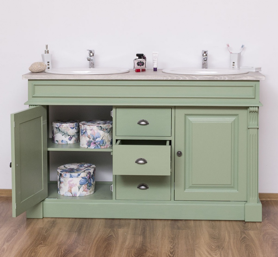 Kúpeľňová skrinka z poctivého borovicového dreva vytvorí úložný priestor v rustikálnom štýle. Povrch skrinky je opatrený farebným náterom odtieňa P054. Vďaka použitej špičkovej technológii sú povrchy lakované dvakrát, takže budú lesklé, hladké a jemné a stále je veľmi diskrétne vidieť podstata dreva pod. Pri nátere je použitých ekologických farieb na vodnej báze, ktoré sú priateľské k životnému prostrediu, čo tento kúsok povyšuje na luxusný ekologický nábytok. Horná doska je hlboko brúsená v odtieni P067. Táto úprava spočíva v aplikácii mechanického postupu vykonávaného modernou mechanizovanou technológiou, kedy sa povrch dreva silne kefuje, tým sa odstránia mäkké časti medzi letokruhmi, načo sa drevo ošetrí moridlom, patinou a nakoniec lak alebo olej v závislosti na zvolenej farbe. S povrchovou úpravou hlbokého búšenia je pocit z masívneho dreva ešte viac zvýraznený, výsledný povrch je tvrdší, drsnejší na dotyk, ale aj odolnejší voči malým nárazom. Vzhľad nábytku je skutočne jedinečný a nemá obdoby.