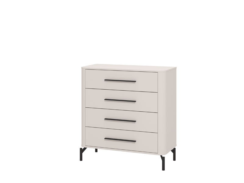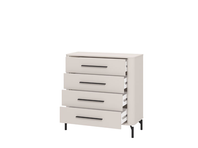 Nábytok je vyrobený z kvalitného lamina a MDF dosiek (dvierka, boky) v matnom kašmírovom dekore. Všetko je doplnené o kovové čierne detaily, ako napríklad úchytky, ktoré podčiarkujú minimalistický moderný dizajn celej kolekcie. Pred opotrebovaním nábytok chráni ABS hrany.