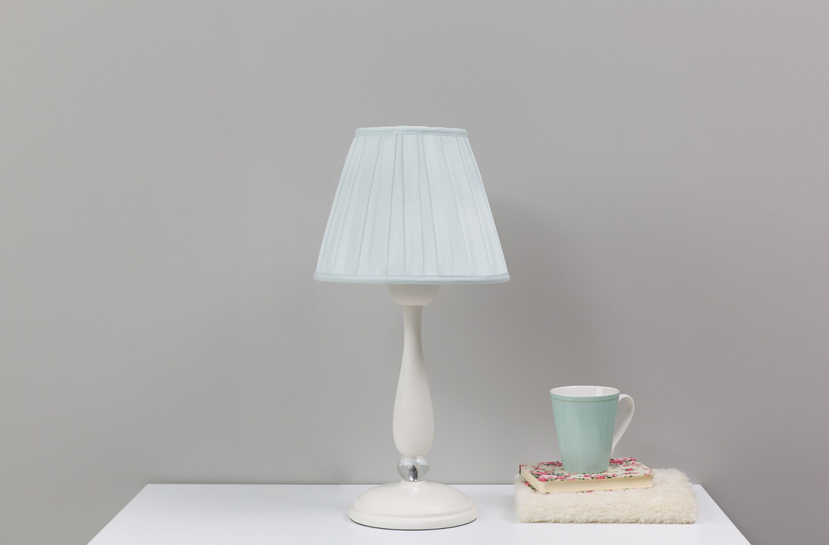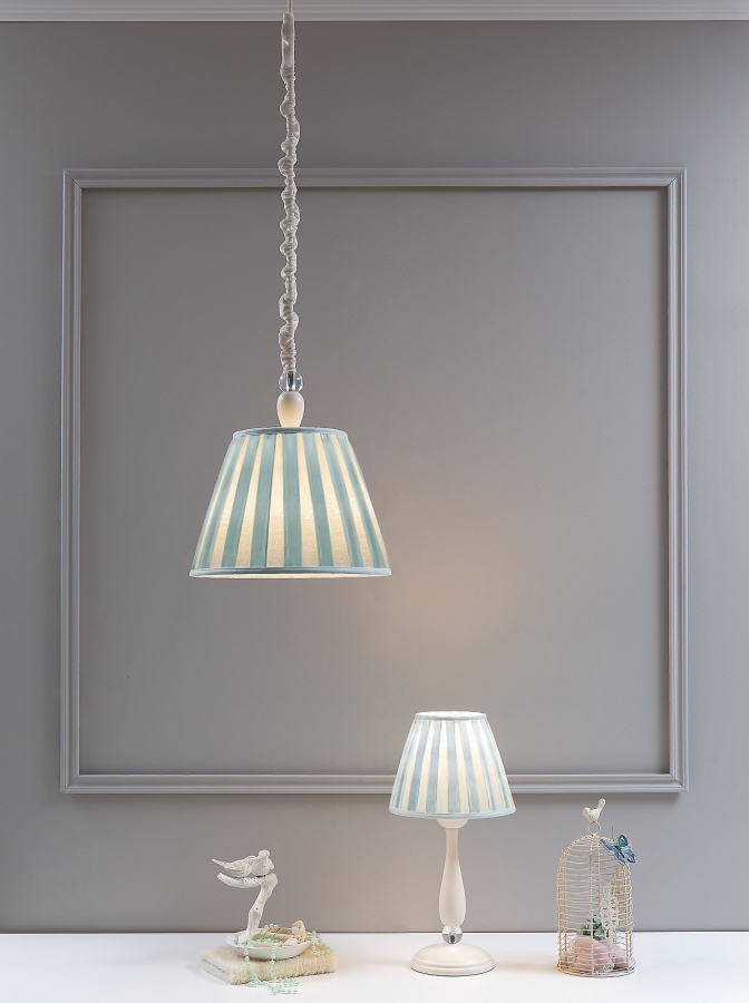 Stolná lampička v mätovej farbe svojim pastelovým odtieňom krásne doplní nežný rustikálny biely nábytok a súhra týchto tónov pôsobí veľmi harmonicky. Produkt sa skladá z klobúka, ktorého konštrukcia, lakovaná hliníková ružice je pokrytá tkaninou. Z vnútornej strany bielou, z vonkajšej skladanou mintovou. Biela noha lampičky je z masívneho maľovaného dreva. Iste vás poteší roztomilý detail, ktorým je priehľadný sklenený korálik. Mala by sa používať ľad alebo energeticky úsporná žiarovka s maximálnou hodnotou 13W. Vyrábané podľa noriem CE. Elektrický kábel je súčasťou.