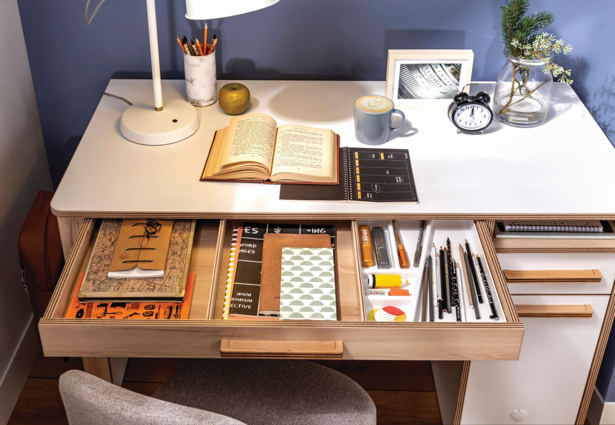 Pevný študentský písací stôl Dylan ponúkne najvyššiu možnú úroveň komfortu každému študentovi. Veľká pracovná plocha a dostatok úložného priestoru zaručí maximálne pohodlie a sústredenosť. Hlavnou výhodou produktu je rozmanitý objemný úložný priestor. Školáci môžu využívať pojazdných zásuviek, poličky či výklenku. Špeciálne zásuvka pod pracovnou plochou disponuje prehľadným vnútorným usporiadaním, ktoré nastolí školskom pomôckam pevný poriadok.