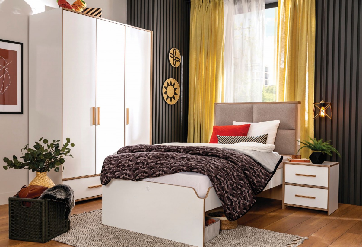 Študentská spálňa je vhodná do chlapčenského či dievčenského študentskej izby. Jemné tóny bielej farby dopĺňa hrejivý dekór dubového dreva. Objemná šatníková skriňa sa postará o dostatok úložného priestoru.