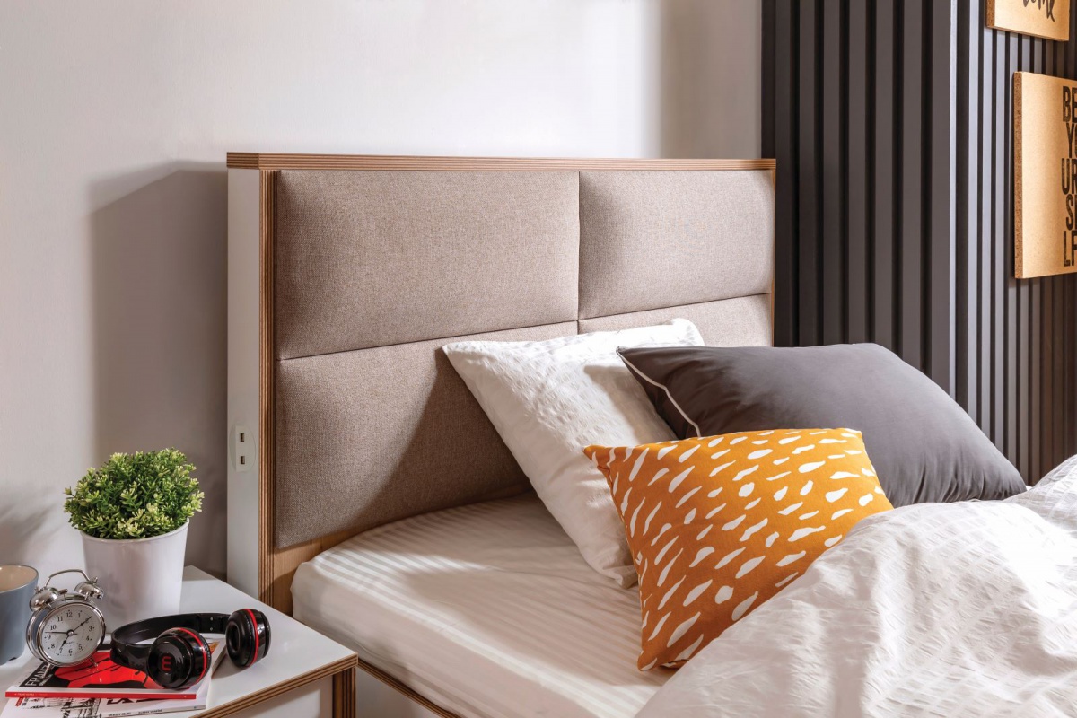 Študentská posteľ s čalúneným čelom Dylan ponúkne užívateľom tú najvyššiu úroveň pohodlia. Vďaka dostačujúce veľkosti spacie plochy s rozmermi 100x200cm bude každý študent vstávať do školy dokonale odpočinutý a plný energie. Vďaka zapracovaným zásuvkám priamo v konštrukcii postele bude mať školák vždy dostatok energie nielen pre seba, ale aj pre svojho vreckového parťáka. Mobilný telefón si tu ľahko zapojí a nabije pomocou bežného USB kábla. K dispozícii sú celkom 2 vstupy. Súrodenci sa tak vyhnú zbytočnej hádke o to, kto si nabije telefón či tablet prvý. K posteli je možné dokúpiť prístelku vhodnú k občasnému prespanie kamaráta či kamarátky. A to tak bez ako aj s úložným priestorom. Oba varianty nájdete nižšie v súvisiacich produktoch. Pohodlie pri sedení na posteli potom zaručí kvalitne spracované čalúnené čelo, ktoré dopĺňa už tak elegantný dizajn výrobku. Kombinácia bielej farby a dekoru dubového dreva zaistí kompaktnosť s každou miestnosťou. Súčasťou balenia je kvalitný perforovaný doskový rošt na spevnenom kovovom ráme. Matrac je nutné dokúpiť zvlášť vo veľkosti 100x200cm. Odporúčané vhodné kusy nájdete nižšie v súvisiacich produktoch.