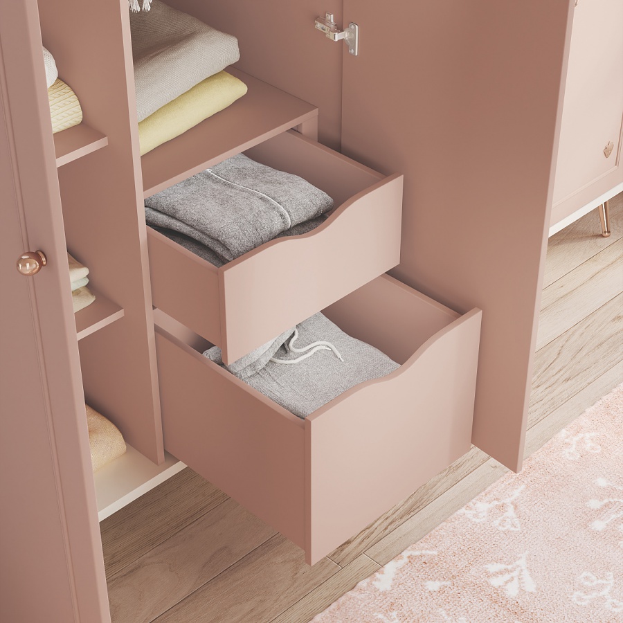 Minimalistický dizajn štvordverovej šatníkovej skrine sa snúbi s nadčasovým vzhľadom, a dodáva tak celej izbe sofistikovaný nádych. Priestranná a luxusne vyzerajúca skriňa sa skvele hodí ako do dievčenských izieb, tak poteší ženy každého veku. Táto skriňa v staroružovej farbe poteší aj tú najnáročnejšiu milovníčku módy! Ponúka totiž dostatok priestoru na každú blúzku, šaty alebo iné štýlové kúsky. V pravej časti nájdete dve široké police a šatníkovú tyč, ktorá sa nachádza pod nimi. Ľavá časť Vás potom poteší praktickým rozložením vo forme veľkého množstva priestranných priehradiek, šatníkovej tyčí a hlbokými zásuvkami. Na zadnej strane skrine sa nachádzajú vetracie ventily, aby sa zabránilo množeniu molí a Vaše oblečenie mohlo dýchať. Kovové úchytky a nôžky v imitácii ružového zlata perfektne ladia s púdrovou farbou.