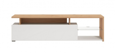 Dávate prednosť televíznemu stolíku pred obývacou stenou? Potom by vás mohol zaujať televízny stolík Alaric, ktorý sa stane neoddeliteľnou súčasťou obývacej izby. Čisté línie a elegantné tvary stolíka vyzdvihuje kontrastné spojenie bielej farby s dekorom dub artisan. Čelná plocha dvierok je v lesku, pričom ostatné časti stolíku sú matné. Televízny stolík tiež disponuje nemalým úložným priestorom v podobe širokých dvierok a odkladacím otvoreným priestorom pod hornou doskou. Do odkladacieho priestoru môžete odložiť herné konzoly, prehrávače a ostatnú techniku. Dvierka naopak poslúži k uschovanie vecí pred nánosom prachu.