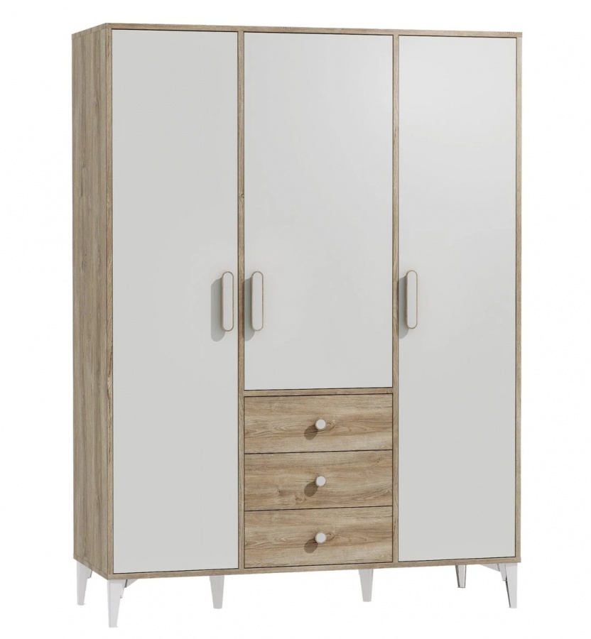 Zaoblené úchytky v bielo-drevenom dekore spríjemňujú manipuláciu a nadväzujú na teplý prírodný tón korpusu. Neutrálna farebnosť skrine sa ľahko zladí s modernými aj škandinávskymi interiérmi – hodí sa do spálne či detskej izby.