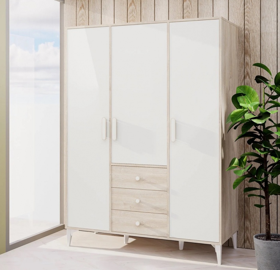 Za trojicou dvierok sa ukrýva prehľadné uloženie pre každodenné potreby: kombinácia policového a šatníkového priestoru umožňuje uložiť poskladané oblečenie aj odevy na vešiakoch, spodnú časť dopĺňajú tri zásuvky ideálne na bielizeň a doplnky.