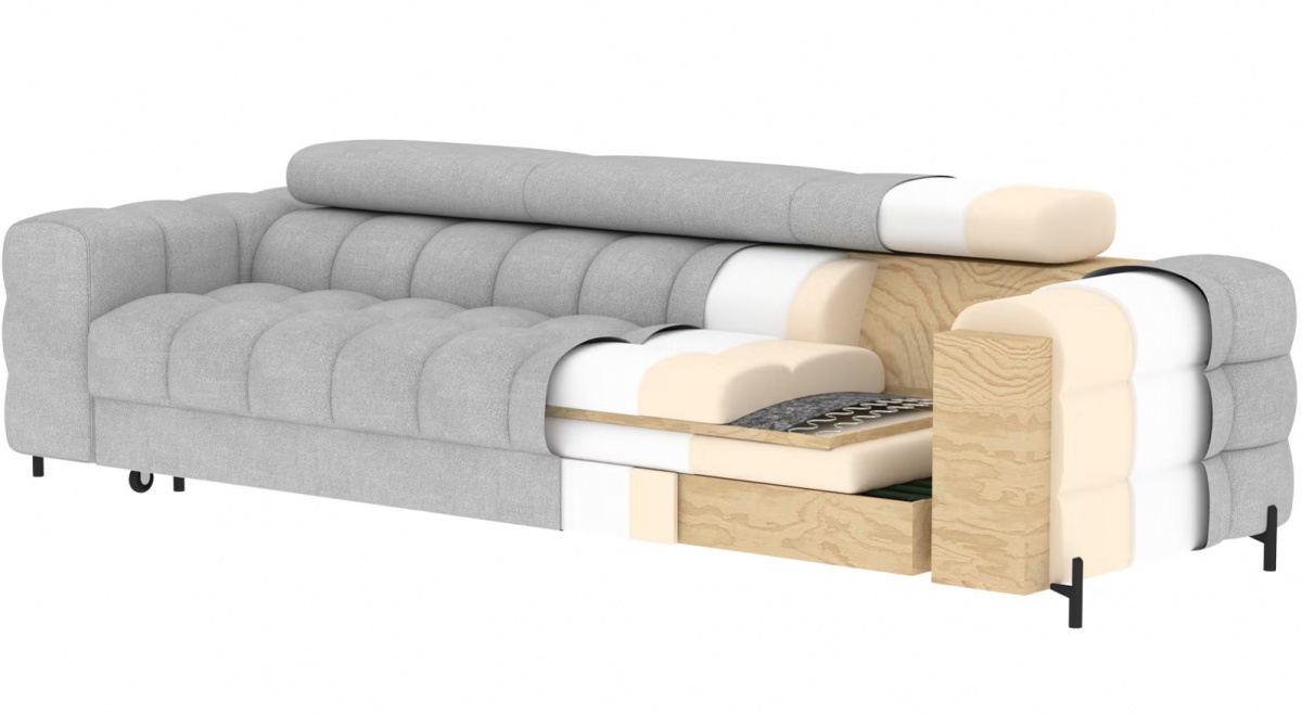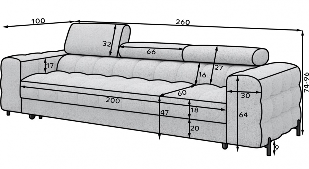 trojmiestna rozkladacia pohovka pre moderné interiéry, ktorá spája čistý dizajn, vysoké pohodlie a premyslenú funkčnosť. Je čalúnená príjemným a odolným polyesterom a jej