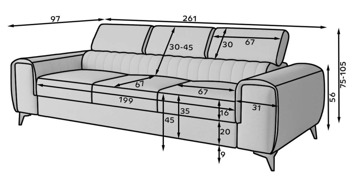 Pohovka Laurence sa skvele hodí aj do menších interiérov, kde nenájde miesto rohová sedačka. Rozmery pohovky sú 261 × 97 × 105 cm (š × h × v). Šírka sedadla 199 cm, výška sedu približne 45 cm a hĺbka sedu 67 cm prinášajú komfort pre každodenné sedenie. Voľne stojace prevedenie umožní umiestnenie kamkoľvek v priestore.