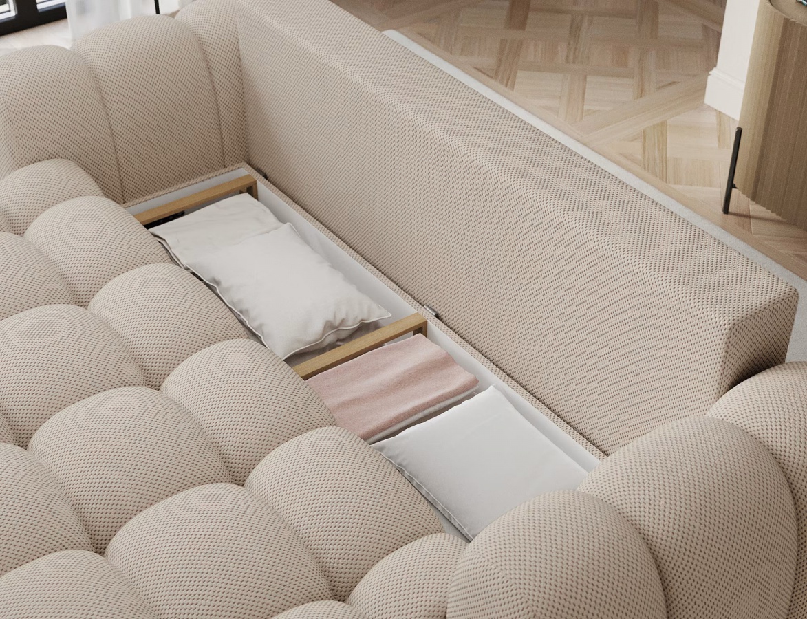 Praktickosť ide ruka v ruke s estetikou: priestranný úložný box 180 × 58 × 24 cm ukryje posteľnú bielizeň, deky aj vankúše a udržuje obývačku bez neporiadku. Čalúnenie z kvalitného polyesteru je príjemné na dotyk, odolné voči každodennému používaniu a ľahko sa čistí. Pohovka Camille je voľne stojaca, takže ju môžete umiestniť doprostred miestnosti bez kompromisov v dizajne.