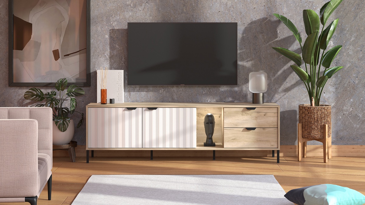 TV stolík je absolútnou nevyhnutnosťou každej obývacej izby. Miestnosť totiž dokáže doladiť k dokonalosti. V pravej časti sa nachádzajú 2 hlboké zásuvky. Hneď vedľa nich nájdete otvorenú priehradku. V ľavej polovici sa za dvierkami nachádza priestor rozdelený zvislou policou. Pruhovaný vzor na dvierkach vytvára unikátny vzhľad. Tento televízny stolík ponúkame aj vo variante s osvetlením.