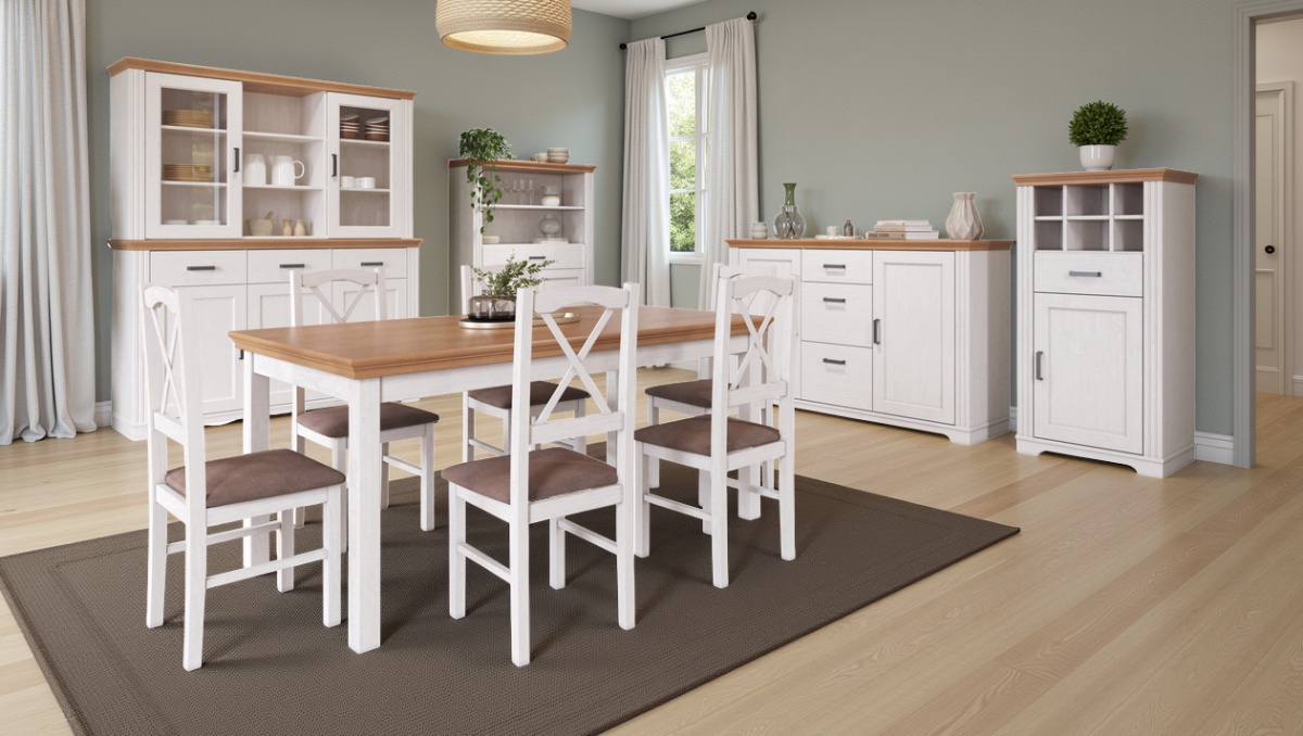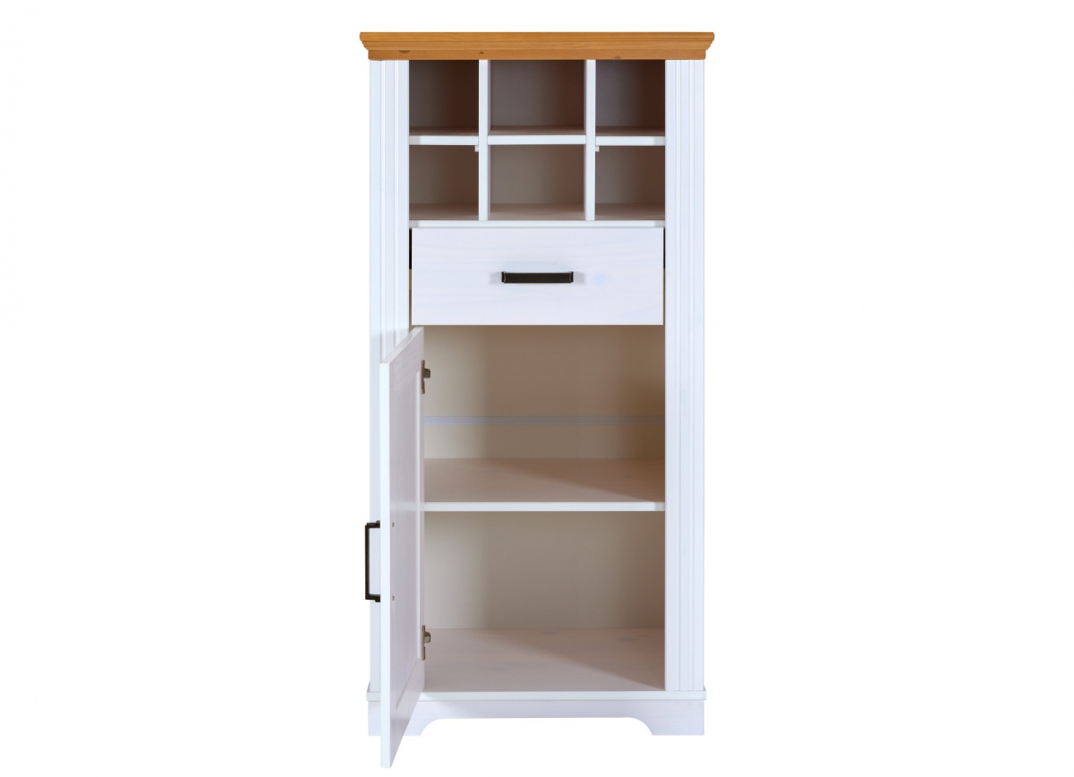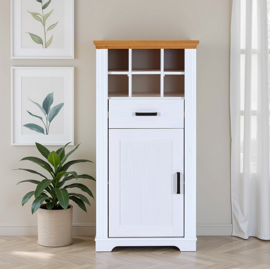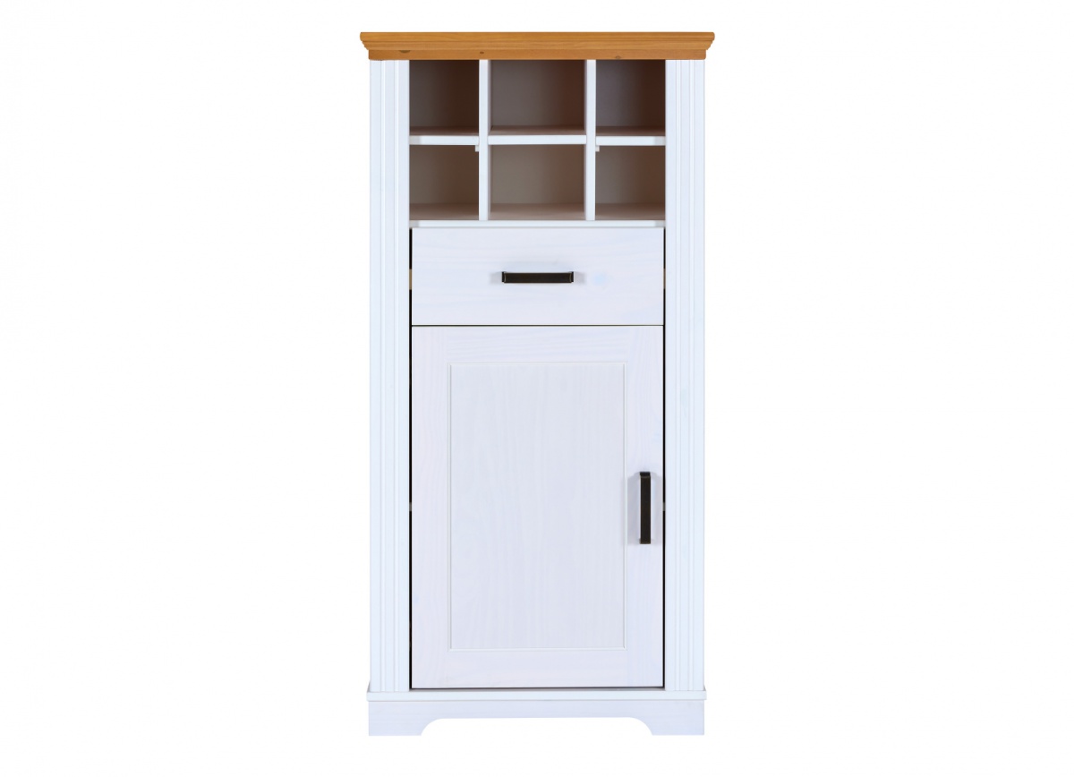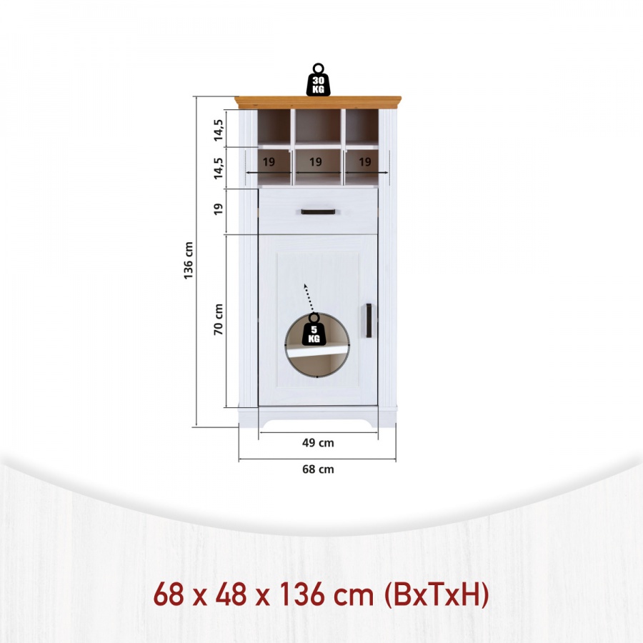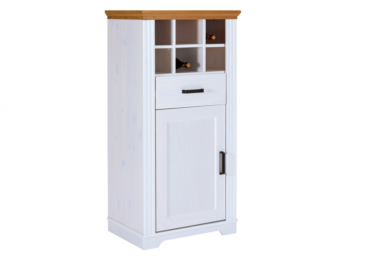 Vinotéka z borovice Malcolm vo farbe biela/dub spája prírodnú eleganciu a funkčnosť.