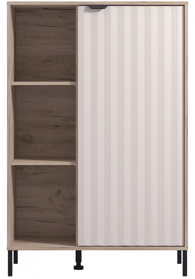 Minimalistická vitrína, ktorá nielen skvele vyzerá, ale navyše aj perfektne poslúži. Navyše je malá a skladná, a tak zapadne aj do užších priestorov. Je opatrená dvierkami, ktoré sú ozvláštnené pruhovaným vzorom, čo vytvára unikátny dizajn. Priestor za dvierkami je rozdelený na 3 hlboké priehradky. V ľavej časti nájdete ďalšie tri otvorené priehradky. Tie môžete dozdobiť dekoráciami. Túto vitrínu ponúkame aj vo variante s vnútorným osvetlením.