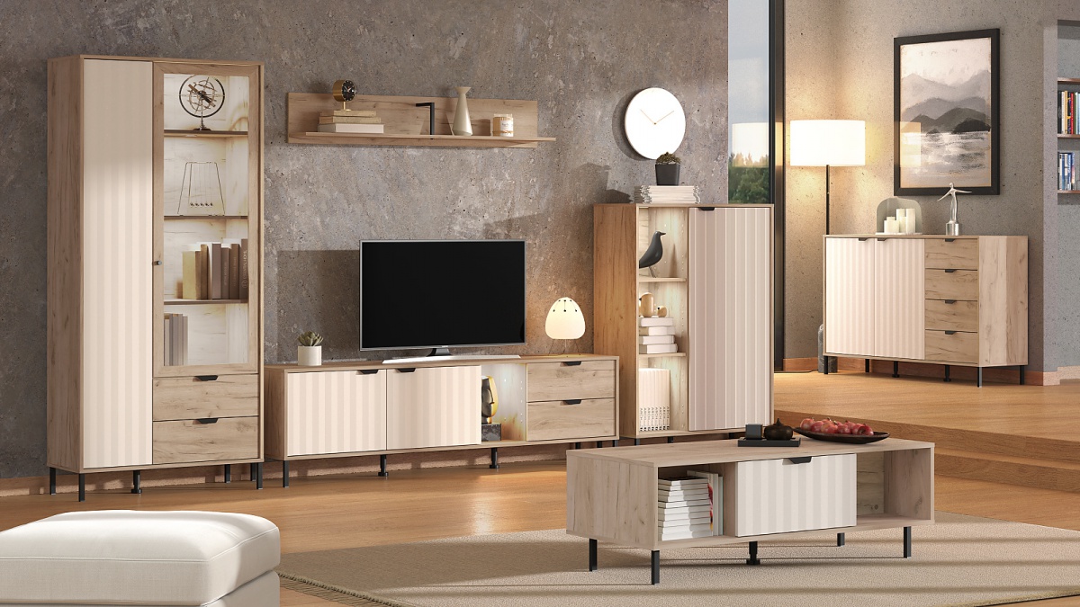 Vysoká vitrína, ktorá nielen skvele vyzerá, ale navyše aj perfektne poslúži. Je opatrená dvierkami, ktoré sú ozvláštnené pruhovaným vzorom, čo vytvára unikátny dizajn. Druhé dvierka sú opatrené zafarbovaným sklom. Priestor za dvierkami je rozdelený niekoľkými policami. V spodnej časti nájdete dve široké zásuvky. Túto vitrínu ponúkame aj vo variante s vnútorným osvetlením.