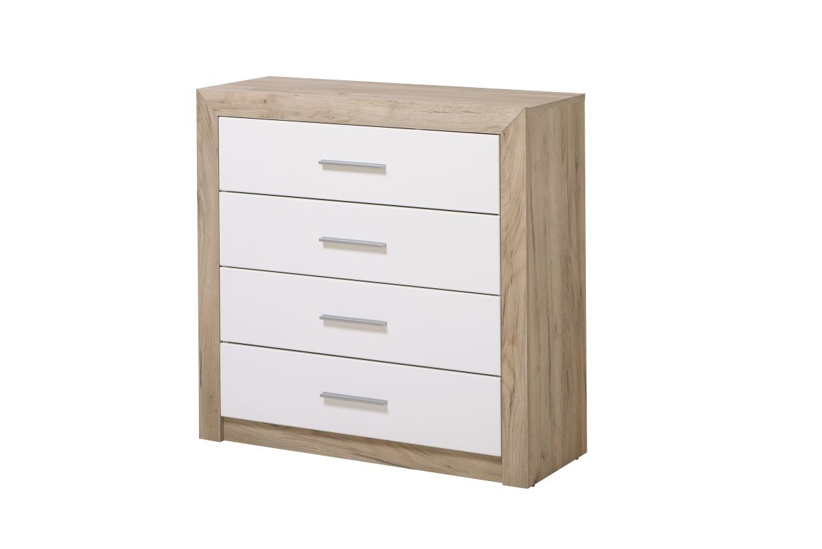 Krásna komoda so štyrmi zásuvkami z kolekcie Shine je vyrobená z lamina v dekore dub šedý v širšom profilu rámu. Čielka komody sú potom z MDF potiahnuté bielou lakovanou fóliou. Zásuvky sa vám budú pohodlne otvárať vďaka štíhlym šedým úchytkám v matnom prevedení. Do priestranných zásuviek pohodlne uložíte všetko potrebné, od nabíjačiek k elektronickým zariadeniam, cez zápisníky, sviečky, kancelárske potreby až po lieky.