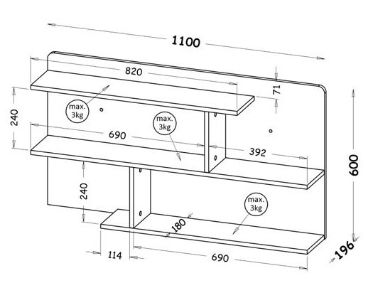 Rozmery závesnej knižnice Liana sú 110x60x19,6cm (š, v, h)