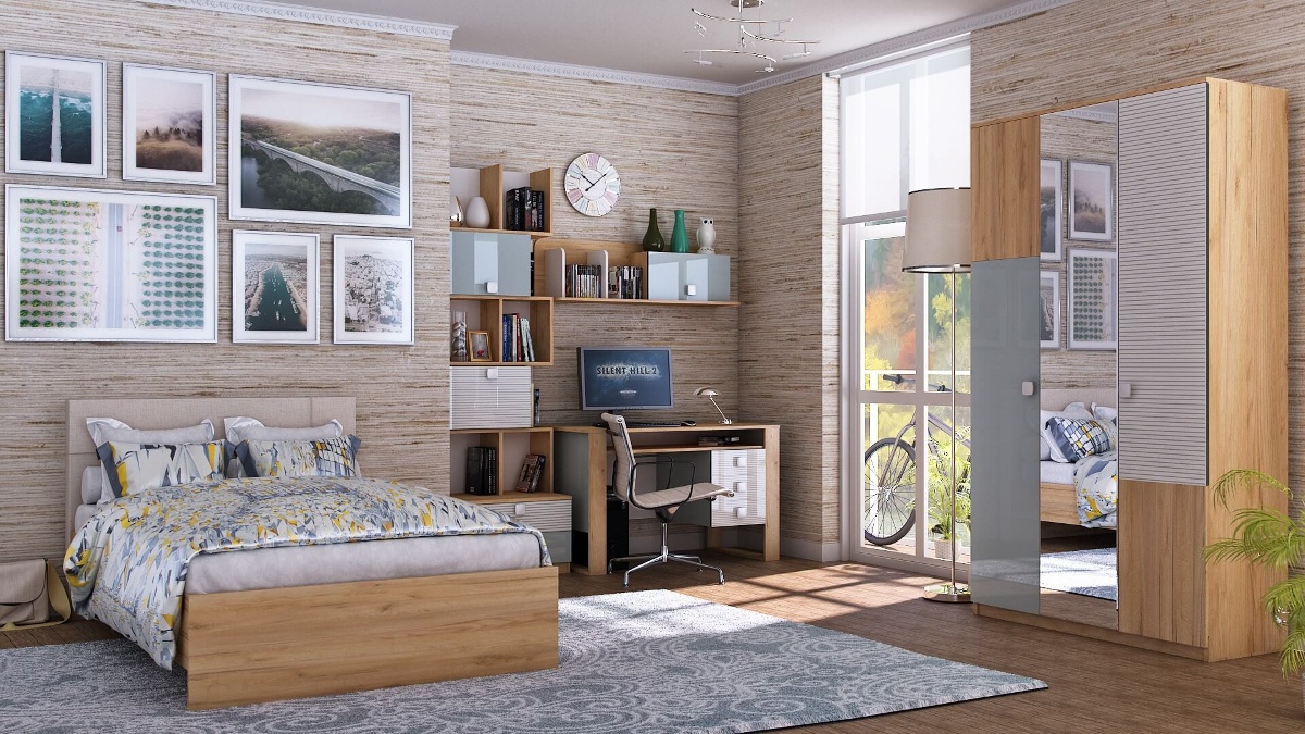 Závesná polica Ezra oživí inak prázdnu stenu a poskytne miesto pre odkladanie dekorácií. Je vybavená výklopnými dvierkami, ktorá ochráni uložené predmety pred nánosom prachu. Kombinácia duba zlatého, modrej a bielej farby je veľmi originálna a atraktívna.